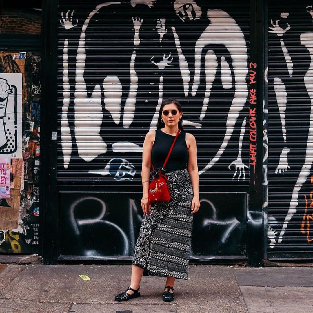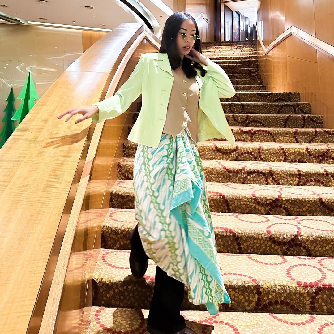 Outfit dari akrtis Hannah Al Rasyid ini cocok untuk Grameds pecinta hitam. Jangan lupa untuk tonjolkan satu warna yang menjadi kontras dengan pakaian hitammu, bisa gunakan kain tradisional berwarna ataupun aksesori lain.